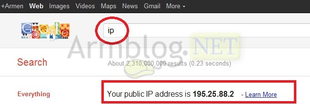 Սակայն այդ հասցեն կարելի է իմանալ նաև առանց կողմնակի կայքեր այցելելու: Անհրաժեշտ է ընդամենը բացելgoogle.com կայքը (google.ru կամ google.am կայքերի դեպքում չի լինում) և որոնել IP արտահայտությունը: Գուգլը անմիջապես կցուցադրի Ձեր Public IP հասցեն: